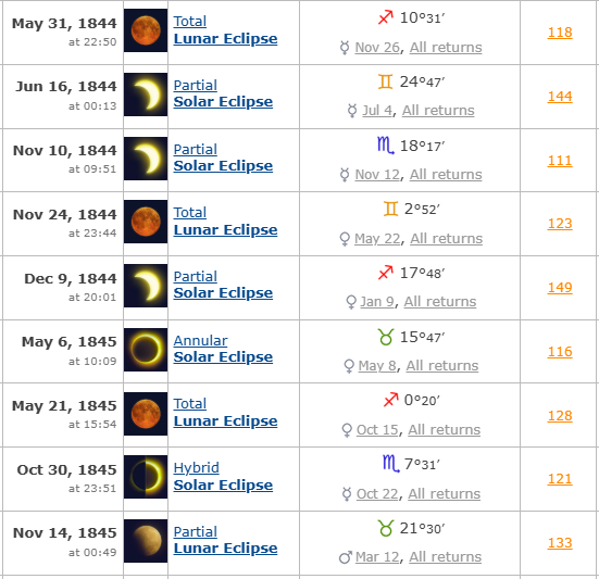 1844/45 coincided with the same Hahnemann Eclipse combination that preceded the important discovery of Neptune at its 36year conjunction cycle with Saturn in September 1846 as follows:
