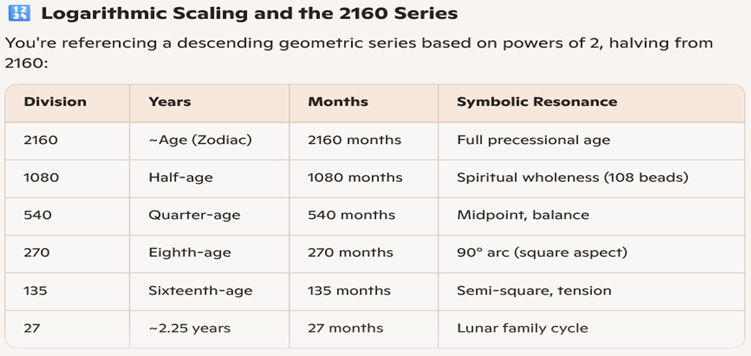 This mirrors log base 10 compression used in Life*Time Astrology and The Divine Plot, where time is scaled to reveal fractal patterns of meaning. The halving sequence also aligns with musical octaves, astrological aspects, and quantum harmonics — a cosmic Fibonacci of sorts.